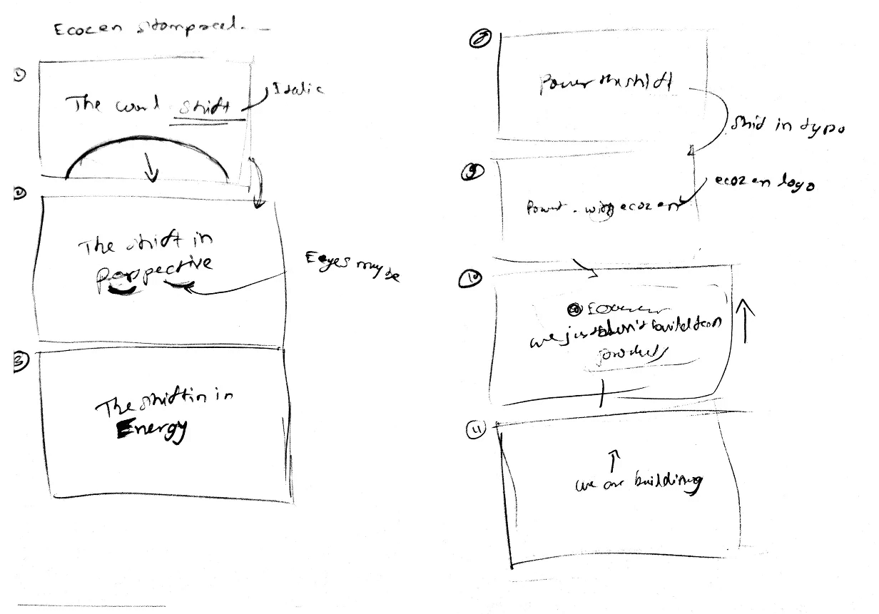 Once the copy was broken into parts, I moved to storyboarding. Here, I sketched out the motion breakdowns; how each line of copy flows, how visuals appear, and where transitions keep the energy alive. This was where the stomp rhythm really started to take shape.